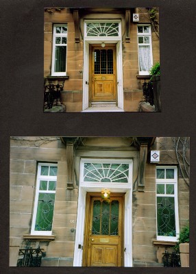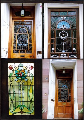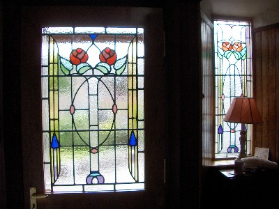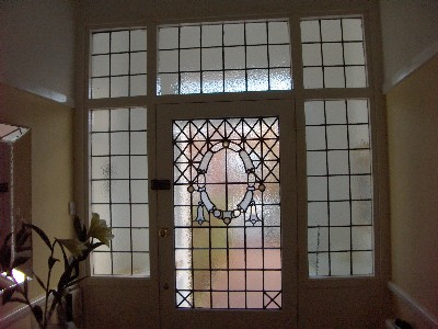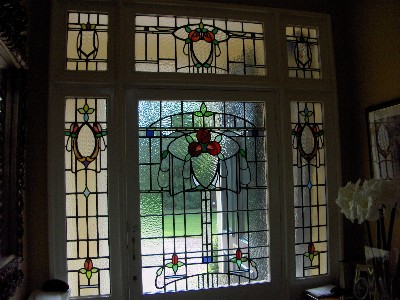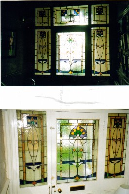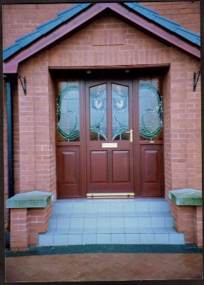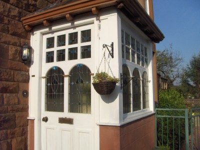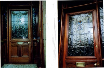 A recent door panel and matching fanlight, made to tie in with original side panel, complimenting a new Cherry wood door perfectly.